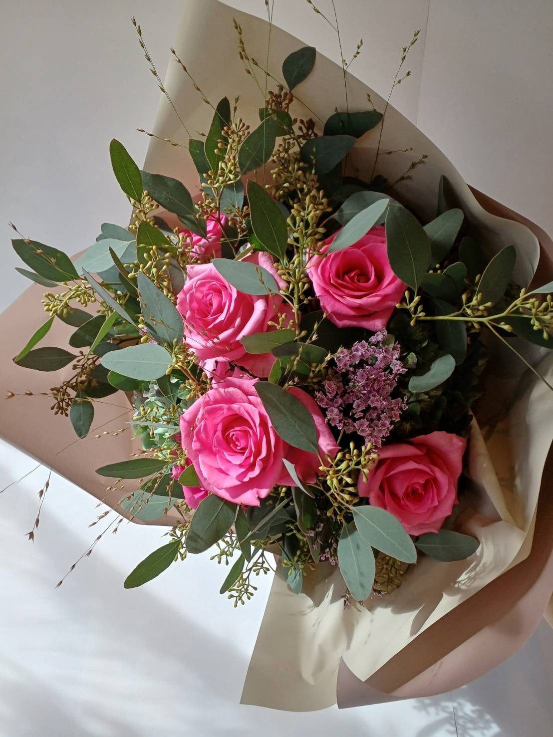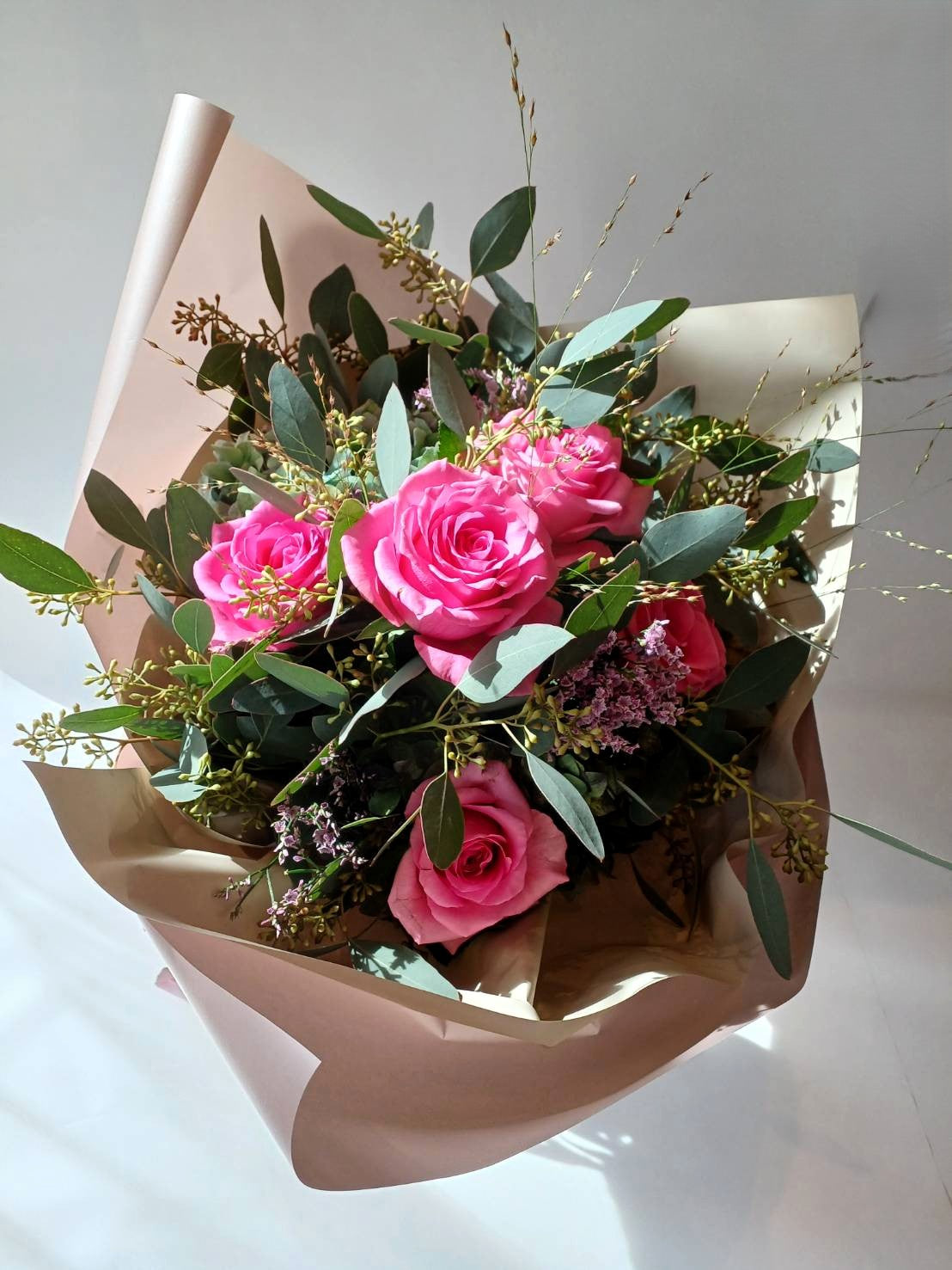 バラとユーカリ、他ドライフラワーになる花材を使用して作りました。