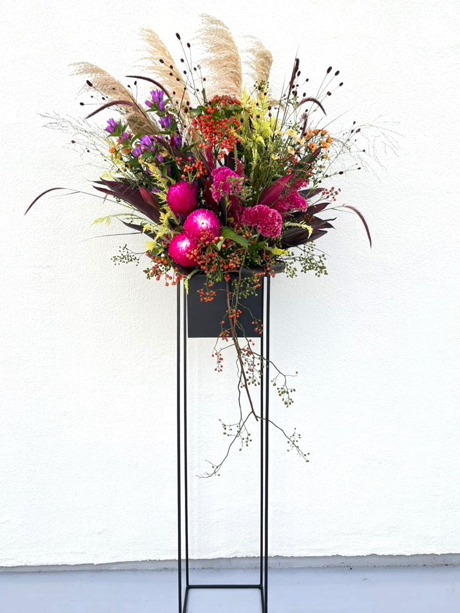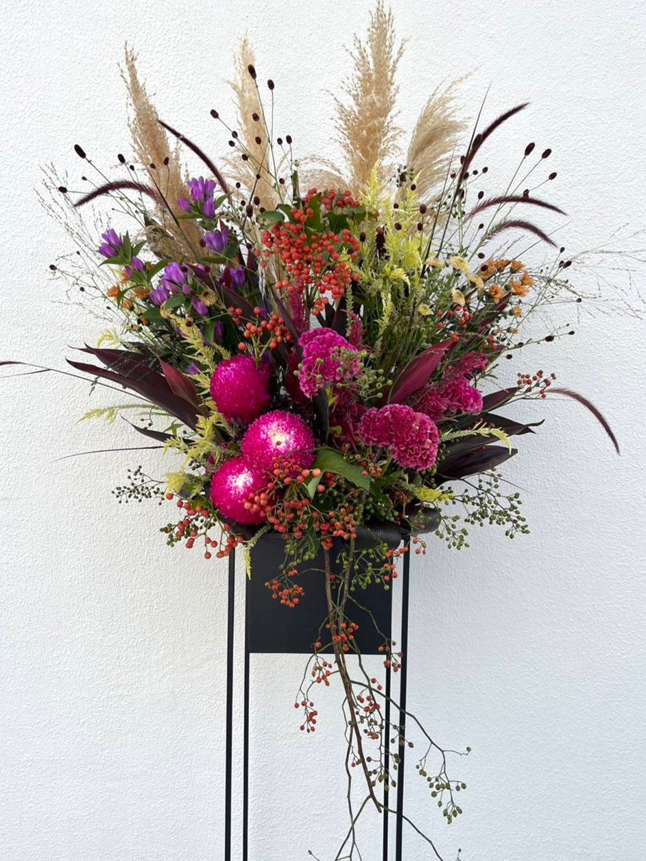 メイン花材 パンパスグラス、リンドウ、ピオニー(カラーマム)